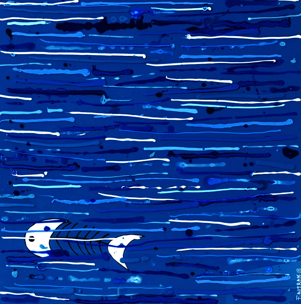 The waves on the surface of the water are painted in relief and add movement to this underwater life that is not lacking! Their horizontal lines bring a feeling of calm which neutralizes the disorder of the school of fish which leaves in all directions. The composition of these blues gives an effect of depth in which our eyes can easily get lost.