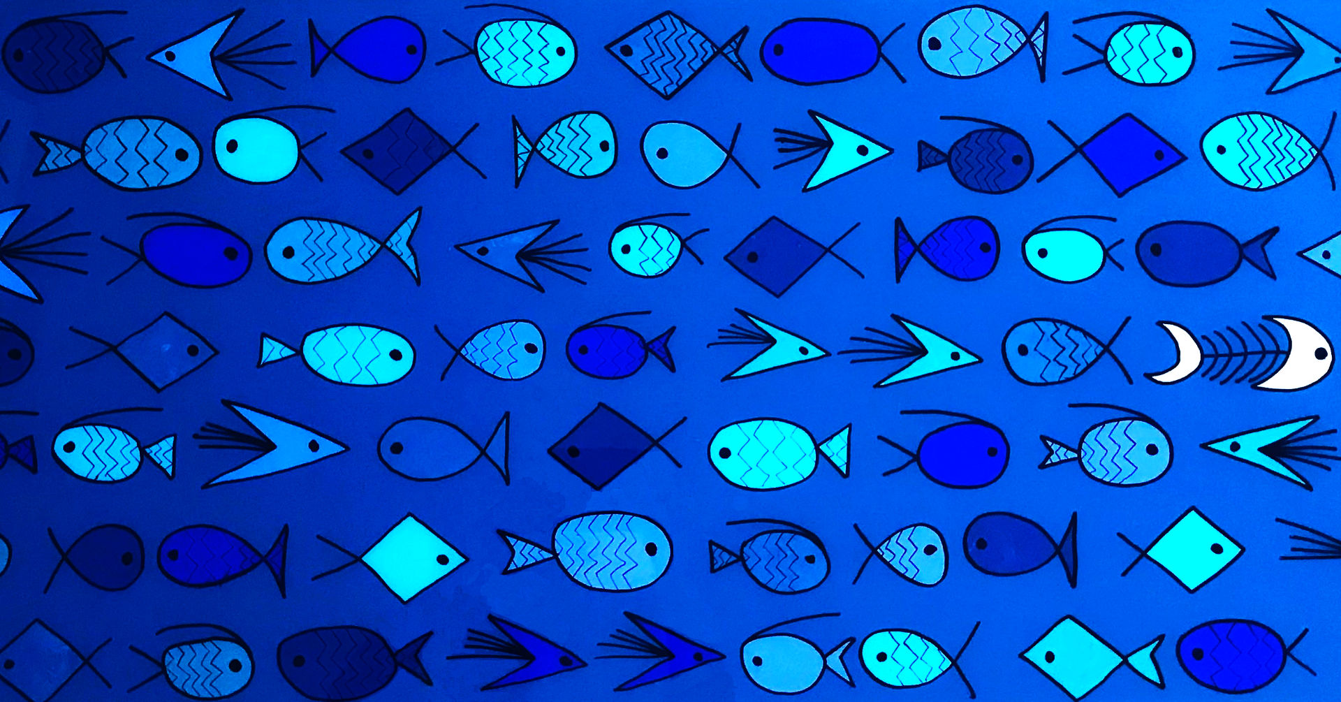 This collection represents a non-uniform school of fish where each animal swims in a random direction. Only one seems unique, while they all are, it is "Chip" the fish bones which denotes by its matt white color. All the others are of various blue hues with shapes depicting their bodies.