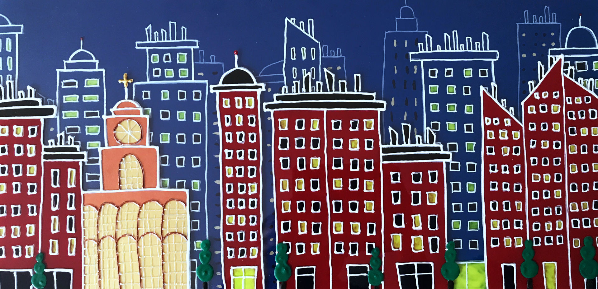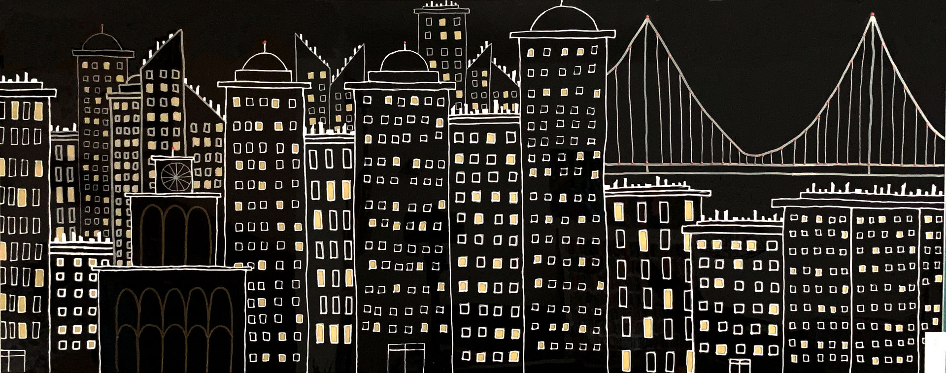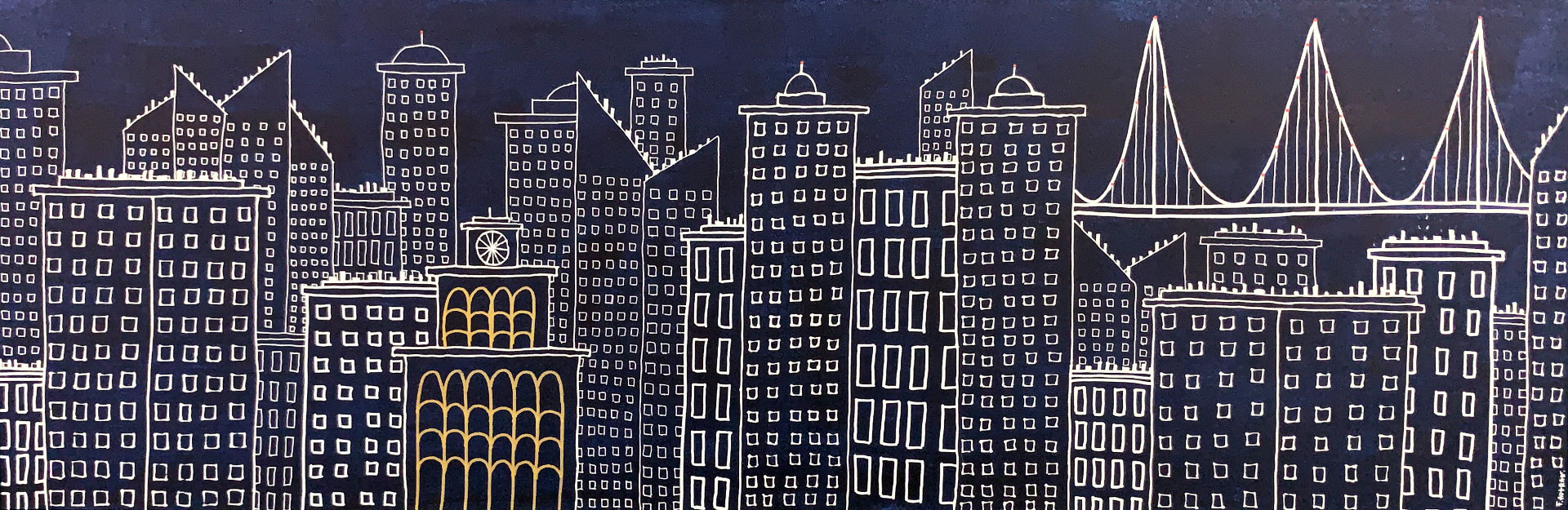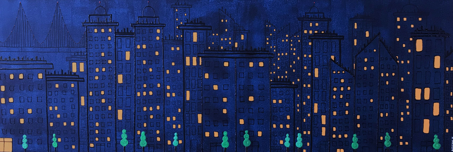 This series of nocturnal urban landscapes, where each point of light is in contrast to the monochrome of the buildings, punctuates the painting while in perspective.