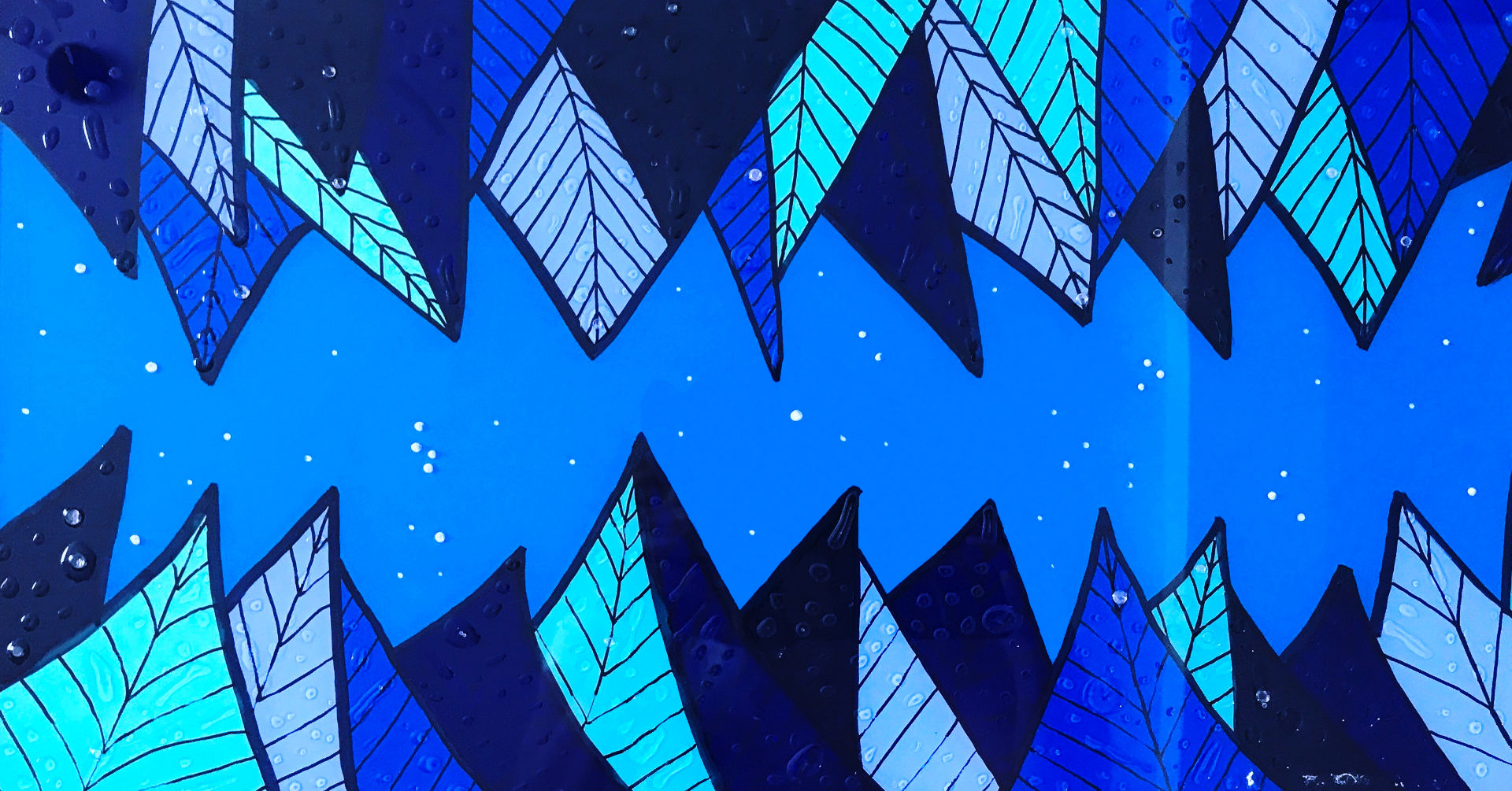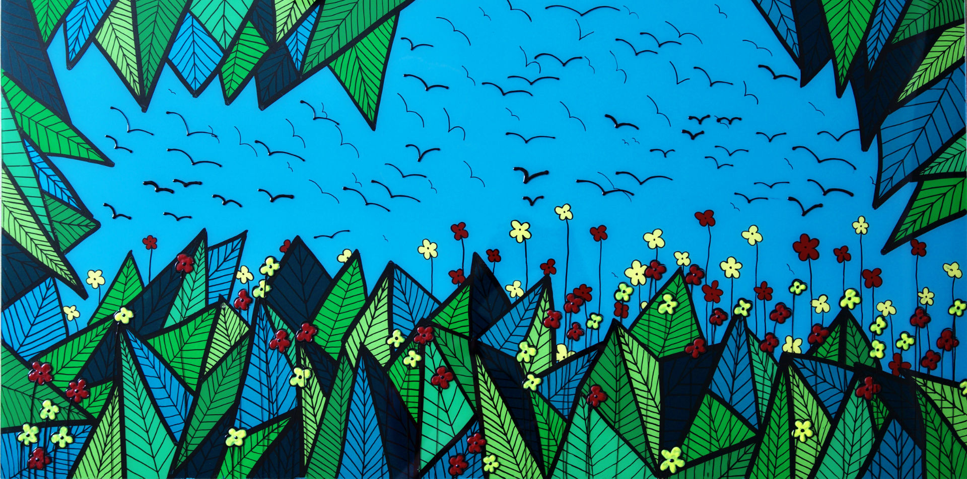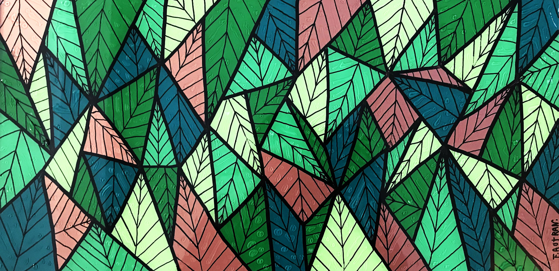 The very graphic foliage brings luminosity to this landscape with shades of the same shade, behind the ribs drawn in felt. Relief drops adorn the leaves which seem to be recovering from a violent thunderstorm or heavy rain.