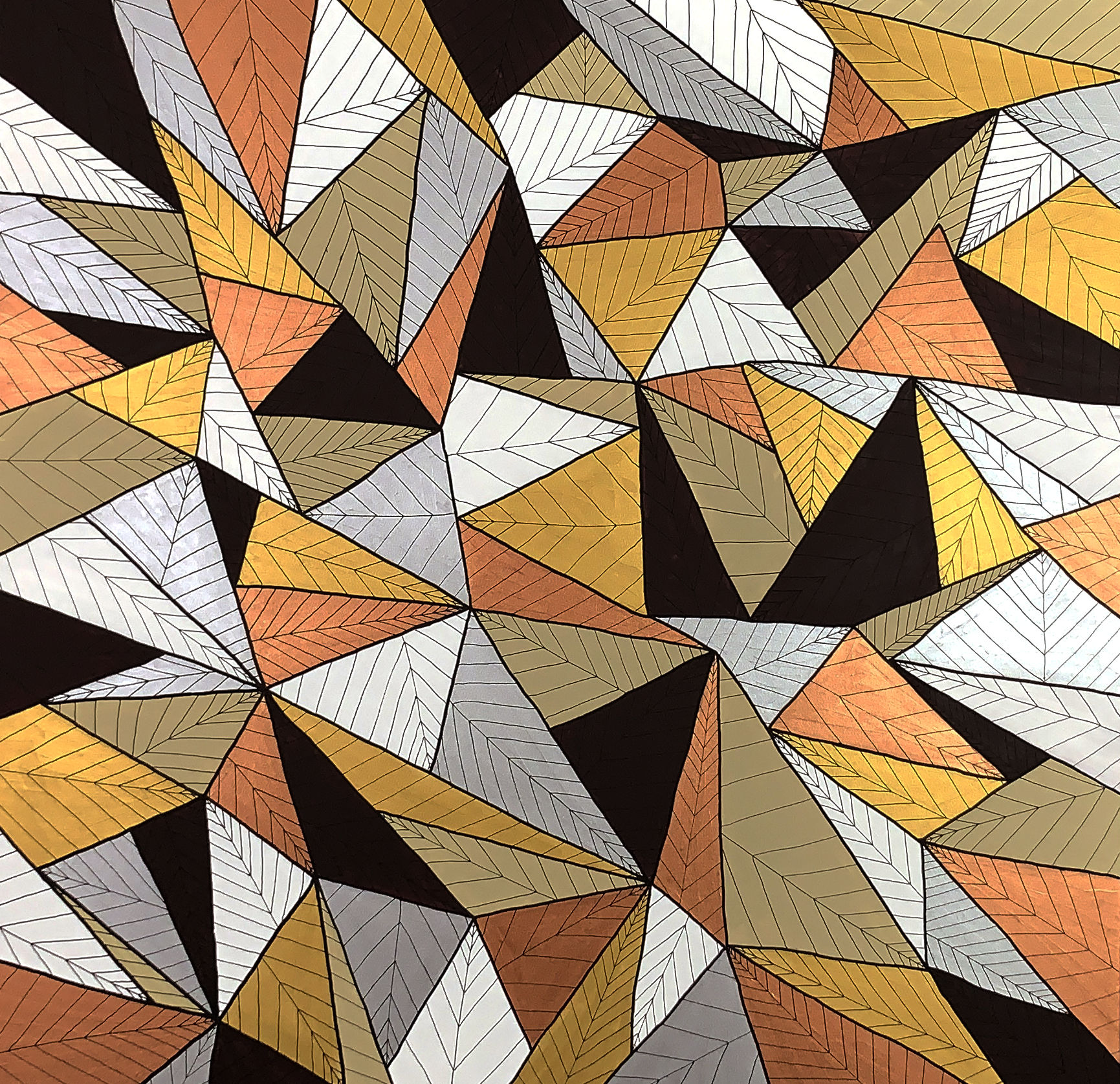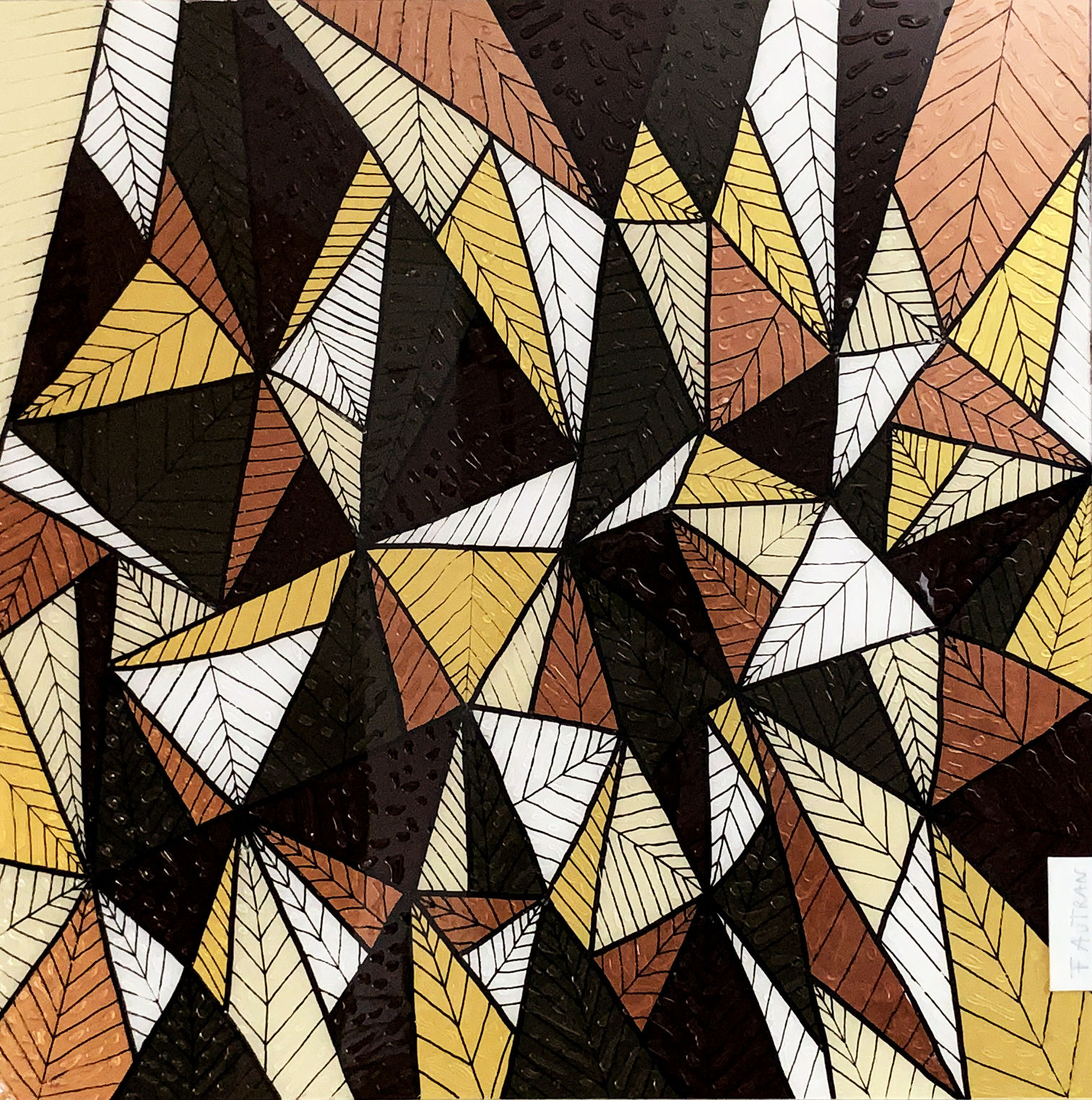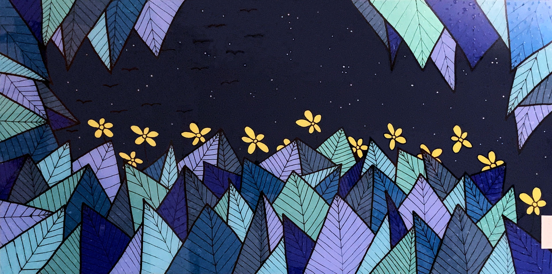 The very graphic foliage brings luminosity to this landscape with shades of the same shade, behind the ribs drawn in felt. Relief drops adorn the leaves which seem to be recovering from a violent thunderstorm or heavy rain.