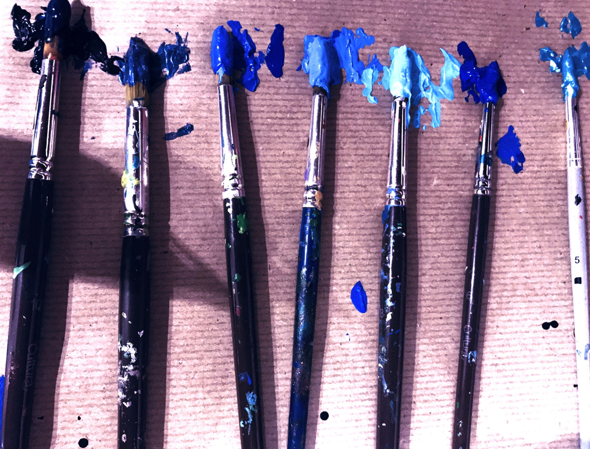 We find, in her workshop, painting in all its forms: in tubes, in pots, in aerosol, in felt pens too, with a panel of varied colors but fairly focused on shades of blue, very present in her creations.
