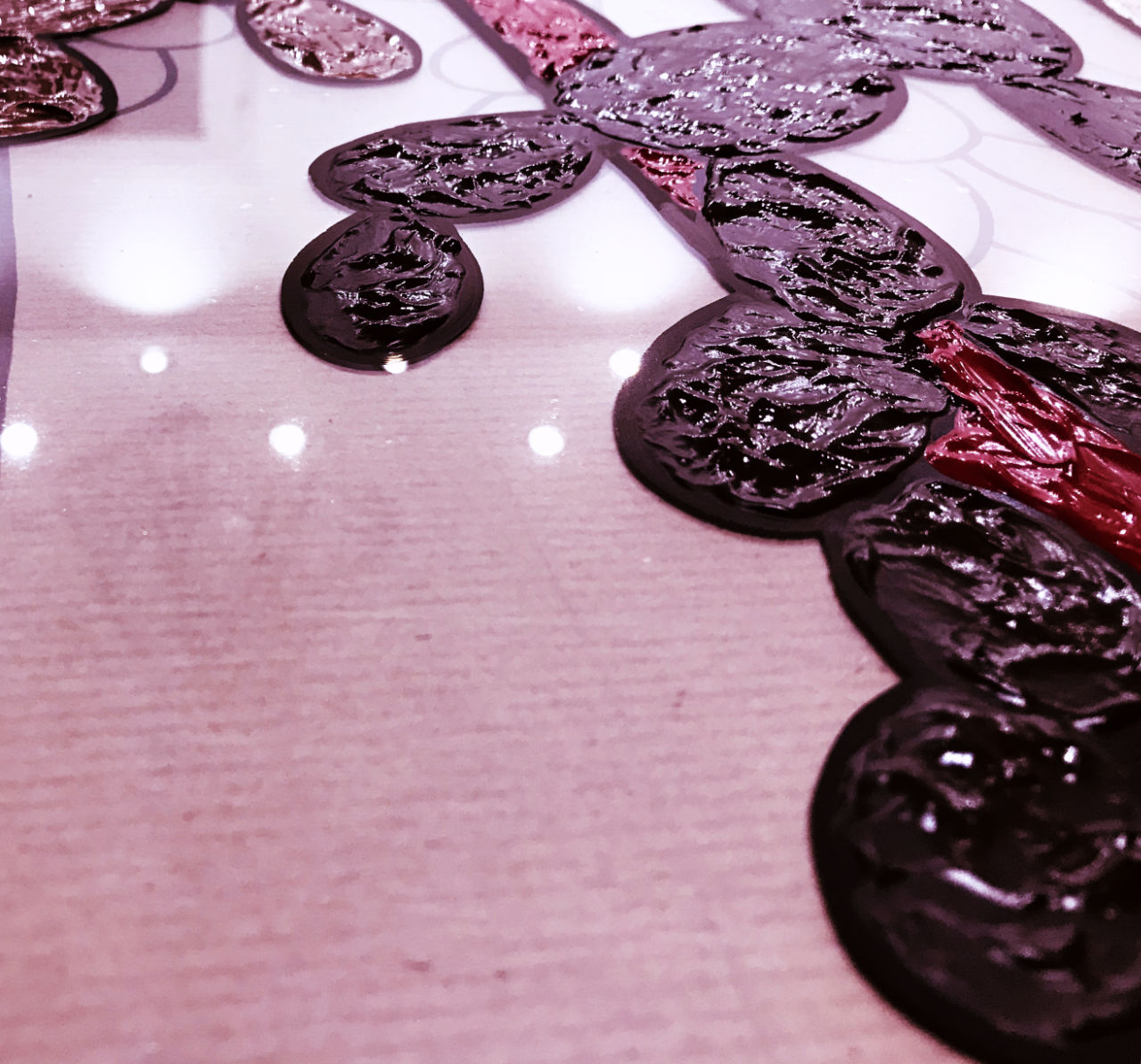 At this point, all the painting part on the “back” side is finished. Let’s go to the “front” side on which Fanny applies relief paint. The flowers of the cacti, certain buildings, the tentacles of the jellyfish or the raindrops on the leaves are painted on the other side of the Plexiglass board and they are all in three dimensions. One of the peculiarities of Fanny Autran's paintings is being able to touch this "recto" which gives the whole "pop" dimension to the painting and makes the patterns inaccessible, as if they were in the case of their display case.