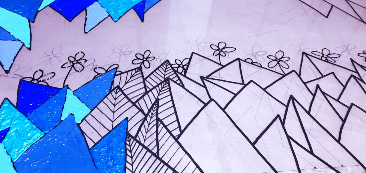 - the “back” side on which each element of the painting is inserted, where each shape, pattern, animal or flora of the landscape takes shape and is colored uniformly. This side of the work has two or more plans, because each table is covered with a solid background, like the deep blue of the JELLYFISHES series or the desert beige of Cream CACTUS.