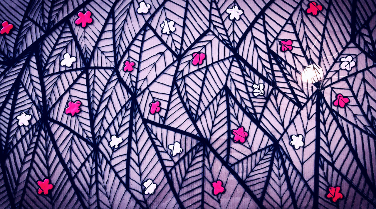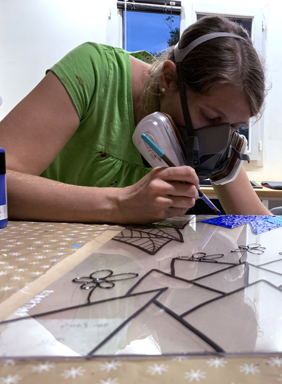 The Plexiglass board, still blank, placed on the primary drawing, will quickly get dressed in acrylic through various tools such as felt, brush, roller, and sometimes even the finger. It is during this stage that the first colors arise to cover the "back side" according to the patterns, shapes, fauna and flora that make up the work in progress. It is precisely, even on large surfaces, that Fanny deposits the paint, taking pleasure in juxtaposing the colors with frenzy, like a race that she delights in never finishing in order to start again with other mixes, other desires for new surprises.
